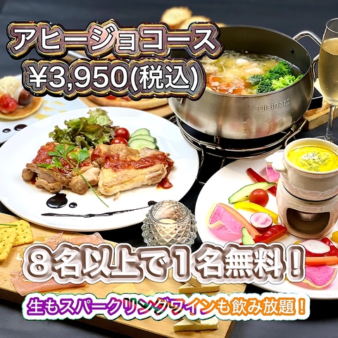 飲み放題2時間+コース料理付きコース3400円よりございます!さらに8名様以上のご予約で、1名様分のコース料金がなんと無料になるコースもございます。