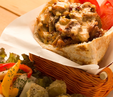 大人気ケバブサンド&シドニー風フライドポテト&自家製ピクルス!全て自家製の当店の看板メニュー、ケバブセット。☆肉もソースも手作りでマヨネーズまで自家製です☆20種類の調味料・野菜・果物のソースに一晩漬け込んだチキンを5種類のソースでお召し上がり下さい。シドニー風フライドポテトも大人気です。ランチにもオススメ!