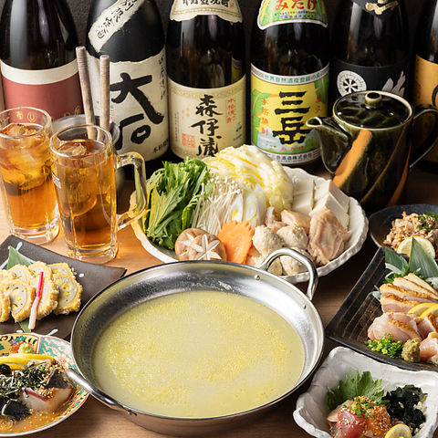 ★2時間飲み放題付★旬の味覚を堪能できる博多風うまいもん極コース。胡麻サバと刺身盛り、親鳥タタキや大根唐揚げ、もつ鍋or水炊きから選べる鍋、明太バター香るスルメイカ、〆は雑炊またはちゃんぽん麺で大満足の全7品。