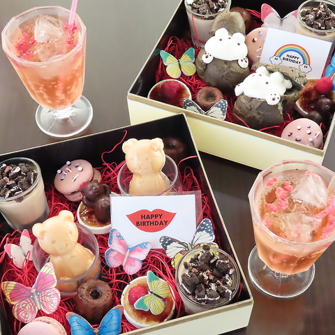 当日予約ok!クーポンからご予約ください♪人数×900円でご用意♪ランチコースに追加や、ディナーで席予約に追加できます。飲み放題付き女子会プラン&デザートbox付きのセットが一番人気♪人数分のご用意になります。