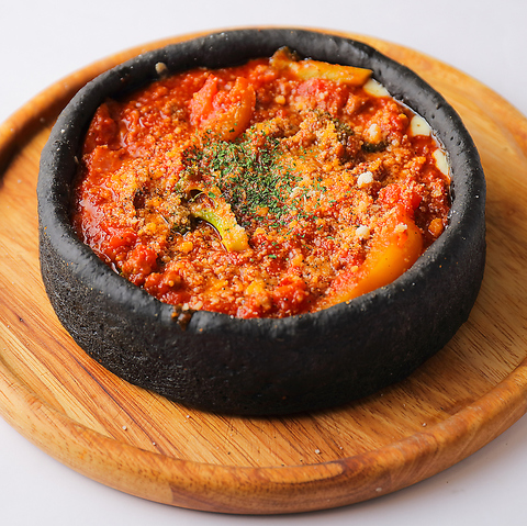 溢れ出る程のたっぷりのチーズと自家製のラグーソース、竹炭パウダーを練りこんで作った生地はインパクト大