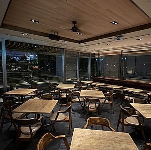 木目調のWoodyなダイニングフロア。大きな窓からは丸の内の夜景が一望できます。2名様~40名様まで。デート、各種宴会など用途は様々。
