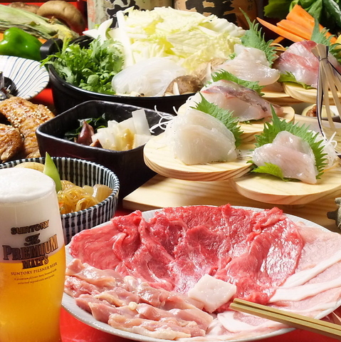 左藤の豪華2大鍋!様々な海鮮が入った『海鮮三昧』と、和牛、豚、鴨、鶏の四種のお肉の贅沢な『肉三昧すき焼き』のどちらかを中心とした宴会です。お刺身3種やチキン南蛮の唐揚げも召し上がれます。