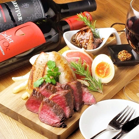 カブリオ一番人気の【カブリオ肉5種盛りプレート】黒毛和牛のステーキ(A4~A5ランク限定使用)、黒毛和牛のローストビーフ(A4~A5ランク限定使用)、国産豚の角煮、ブランド鶏モモ肉の塩焼き、四元豚のソーセージと内容ボリュームともに文句なし!※仕入状況により内容が変わる事がございます。