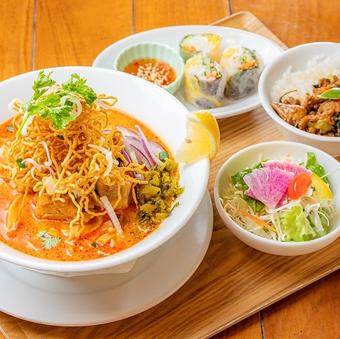 ■Chaing mai Style Chicken Curry Noodles■Small Basil Chiken Rice■Fresh Spring Roll■Small Saladココナッツミルクのマイルドさの中にスパイスが効いたカレースープ。北タイ・チェンマイ名物カレーヌードル「カオ・ソーイ・ガイSet」麺・ごはん大盛り…300円(税込)Rice/Noodles Large Portion