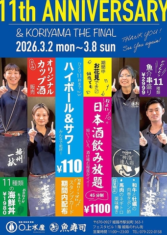 3/2(月)~3/8(日)の期間、11周年を記念しまして、11種類魚介串盛りやハイボール&サワー110円などご用意◎