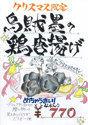 烏賊墨の鶏唐揚げ!漆黒クリスマスチキンをご用意しております!ブラックサンタからの贈り物をどうぞ◎