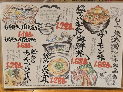 サーモン丼1680円(税込)/塩サバ定食1280円(税込)ご飯の量は変更できます!(小・普通・大盛り)/海鮮丼1680円(税込)/飲める穴子丼1280円(税込)/飲めるカキフライ丼1280円(税込)/お寿司ランチ8貫盛り1100円(税込)/お寿司ランチ12貫盛り1680円(税込) ※全てお味噌汁付き♪