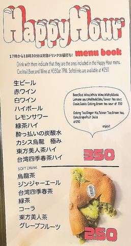 17時~18時30分まで!生ビールやワイン、酎ハイなど対象ドリンクが350円!対象のソフトドリンクは250円!