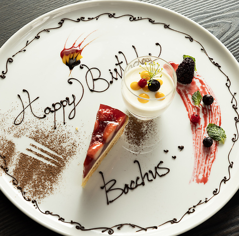 誕生日・記念日にご利用のお客様にメッセージ入りのデザートプレートをプレゼントいたします!!(要予約)メッセージの内容や演出などはあらかじめスタッフにご相談ください。特別な日はぜひ当店でお過ごしください♪