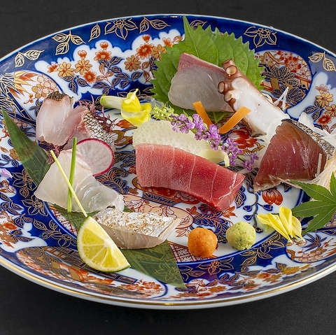 季節の鮮魚お任せ盛り。日によって魚種は様々ですが、中には滅多にお目にかかれないような希少な魚種の入荷があることも!魚種についての詳細はスタッフまでお尋ねください。