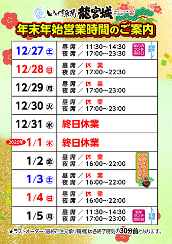 年末年始は特別営業となります!スマホの方は左記URLをコピペください→https://ryugujo.webu.jp/form.html