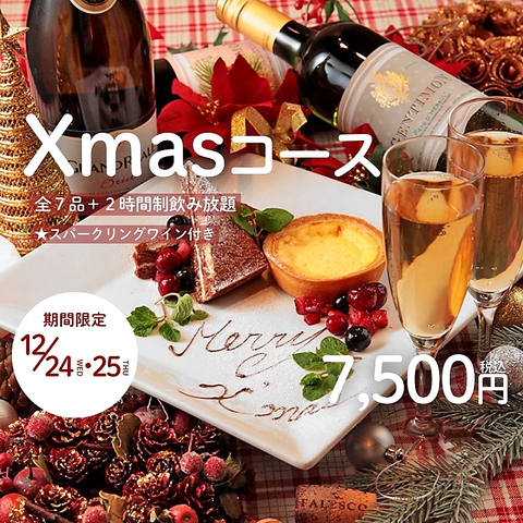 スパークリングワイン付きお料理7品+120分飲み放題。Xmasプレートを含む色鮮やかなお料理をご用意しております。最初のスパークリングワインのボトルをノンアルコールに変更可能です。<忘年会・新年会・宴会・団体様歓迎>