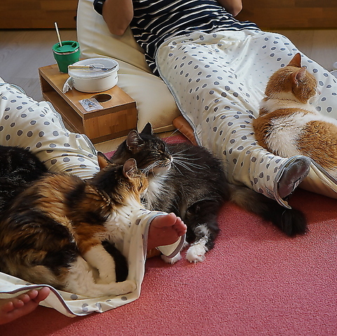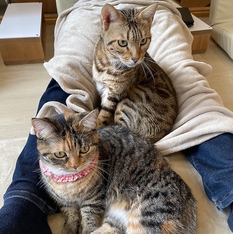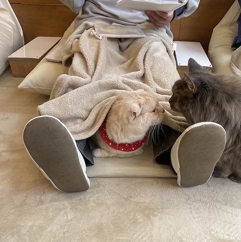 座椅子に座っているとネコちゃんたちがお膝に載ってきてくれる♪