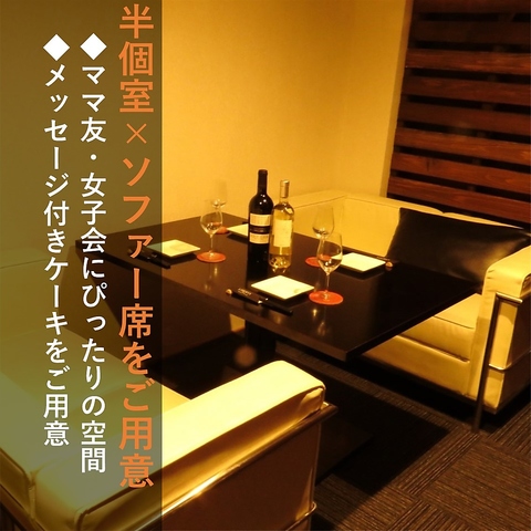 4名様までのソファ半個室。女子会やママ会など、ゆっくりお食事を楽しみたい方に最適♪