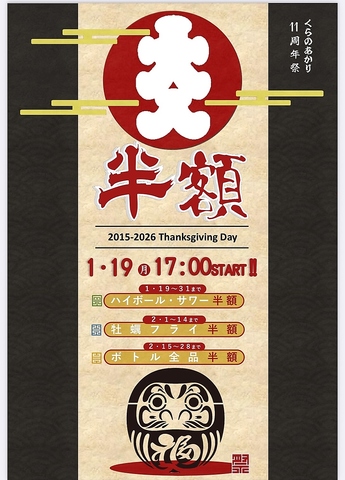 1/19(月)17:00~くらのあかり周年祭を開催!期間中は対象メニュー・ドリンクを半額でお楽しみいただけます♪