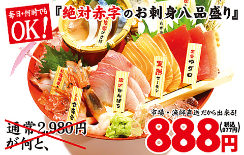 海の幸を、とことん贅沢に!職人が目利きした旬の鮮魚を、市場から直接仕入れ。鮮度抜群な自慢のお刺身8種を、彩り豊かに盛り付けた自慢の一皿です。