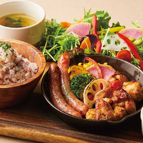 アボカド豚のソーセージにハーブチキンそして各種焼き野菜が入ったボリューム満点大満足プレート!ランチタイム(17:00まで)はお野菜パン&雑穀米が食べ放題他にイタリアントマトハンバーグ、グリル玉ねぎBBQハンバーグ、グラタンハンバーグの4種類のハンバーグをご用意♪阪急百貨店おすすめランチ、是非ご利用ください♪