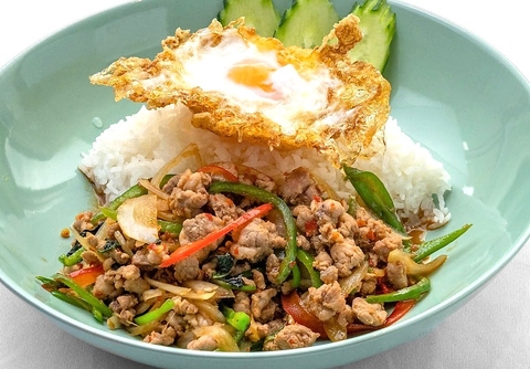 「マイペンライ」こだわりの“ガパオライス”。辛口スタミナ系タイ料理!ガパオはアジアで「ホーリーバジル」とも呼ばれる神聖なハーブです。パンチの効いた中にもほんのり香るさわやかさをお楽しみください。伏見でタイ料理をお探しでしたらぜひ当店へ!