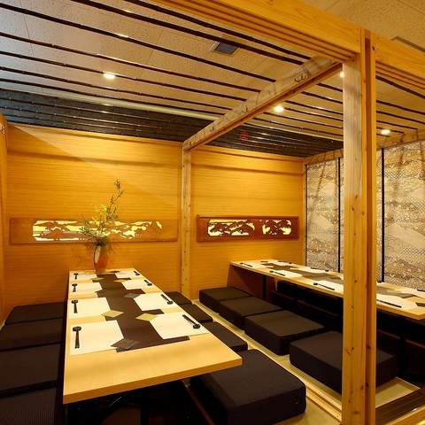 【完全個室】落ち着いた和の雰囲気が漂う店内は少人数様でもご利用頂ける個室席もございますので、接待や会食などのビジネスシーンやデート、記念日など大切な日のお食事にもご利用頂けます。人数やお部屋の希望などのご要望等がございましたら、お気軽にご相談ください。