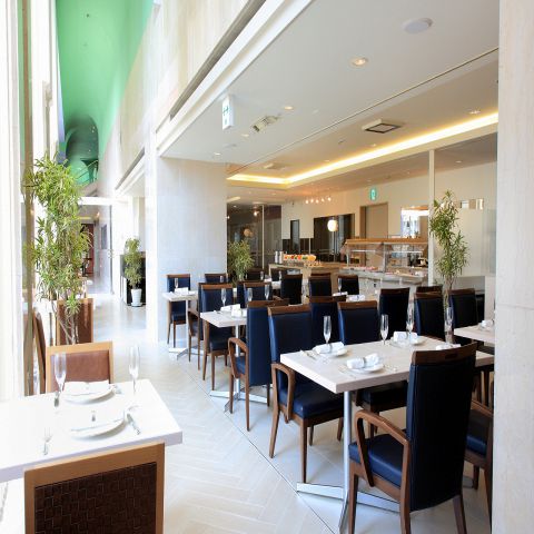 吹き抜けのある開放的な店内は、白と白木をベースにした明るく清潔感ある雰囲気。大きな窓からは陽光がふりそそぎホテル中庭を望めながら季節の移り変わりをお愉しみいただけます。