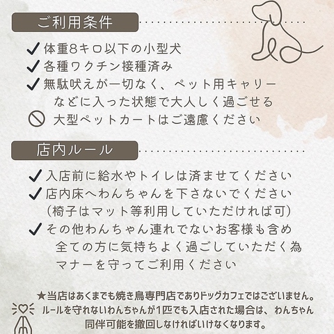 ■店内ルール●入店前に給水やトイレは済ませてくださいませ。●店内床へワンちゃんを下ろさないようお願いいたします。(椅子はマット等ご利用いただければ可)。●ほか、わんちゃん連れではないお客様を含め、全ての方に気持ちよくお過しいただく為、マナーを守ってのご利用を心よりお願いいたします。