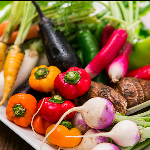 静岡・三島市の杉正農園から直接仕入れる新鮮野菜は、富士山の清らかな水に育まれた瑞々しさと甘味が魅力。皮ごと生で食べられるほどの鮮度を持ち、加熱すると旨味が凝縮し違った表情を見せます。イタリア料理でありながら、日本に近い感覚で四季を映し出す料理として表現し、彩り豊かな一皿をお楽しみください。