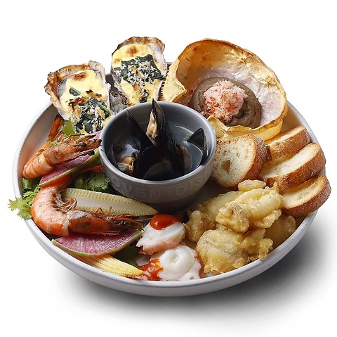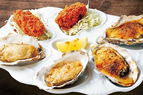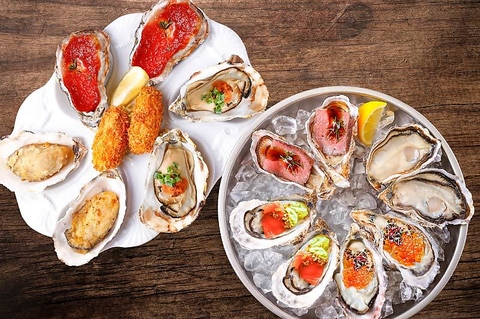 生牡蠣 2個/イクラと白だしジュレのオイスターカクテル 2個/スモークサーモンとアボカドワカモレのオイスターカクテル 2個/ローストビーフとトリュフソースのオイスターカクテル 2個/ウニと牡蠣醤油の焼き牡蠣 2個/トマトガーリックソースと香草の焼き牡蠣 2個/牡蠣のバターソテー 2個/カキフライ2個