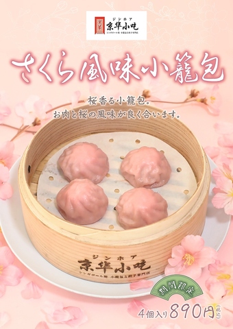 期間限定メニュー「さくら風味小籠包」が新登場☆見た目は華やかな桜色、思わず写真を撮りたくなるような可愛らしさです。ジューシーなお肉をふわっと包み込むような優しい桜の風味をお楽しみ頂けます♪お食事の際の追加の一品、女子会や季節宴会でのご注文にも大変おすすめです。