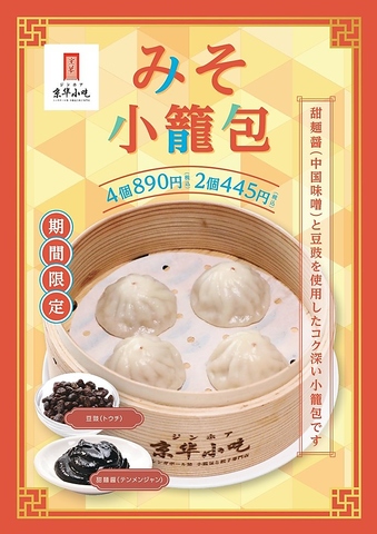 この季節、ぜひ味わっていただきたいのが、期間限定の「みそ小籠包」です。フワッとした皮の中には、ジューシーな肉とともに、甜麺醤(中国味噌)と豆鼓を使用した深いコクが広がります。みその芳醇な香りと、肉汁が絶妙に絡み合った小籠包です。ぜひお楽しみください♪(2個:445円(税込))