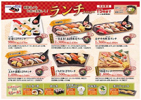 平日11~15時限定!!【1】冬の旬盛りランチ1430円(込)【2】定番にぎりランチ1078円(込)【3】おすすめ鮮魚ランチ1496円(込)【4】ごちそうにぎりランチ1650円(込)【5】一日五食!まる得限定ランチ1430円(込)【6】上ネタ満腹握りランチ1540円(込)【7】特選ランチ1980円(込)