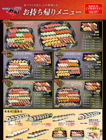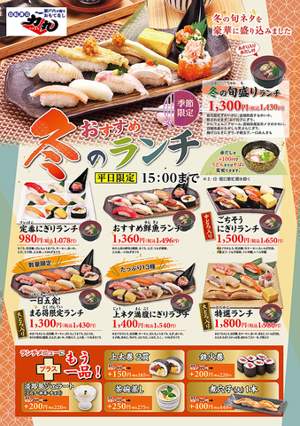 平日11~15時限定!!【1】冬の旬盛りランチ1430円(込)【2】定番にぎりランチ1078円(込)【3】おすすめ鮮魚ランチ1496円(込)【4】ごちそうにぎりランチ1650円(込)【5】一日五食!まる得限定ランチ1430円(込)【6】上ネタ満腹握りランチ1540円(込)【7】特選ランチ1980円(込)
