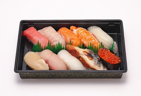 本まぐろ中とろ・真鯛・赤いか・びんちょうまぐろ大トロ・いくら軍艦・生サーモン・平貝・赤えび・ぶり・うなぎ蒲焼