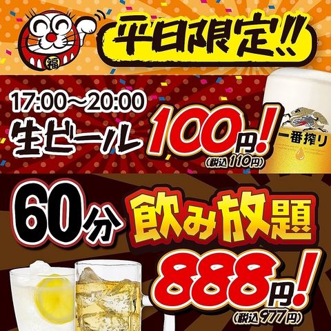 平日限定で60分飲み放題が977円(税込)!また17:00~20:00まで生ビール110円(税込)もぜひご利用ください♪