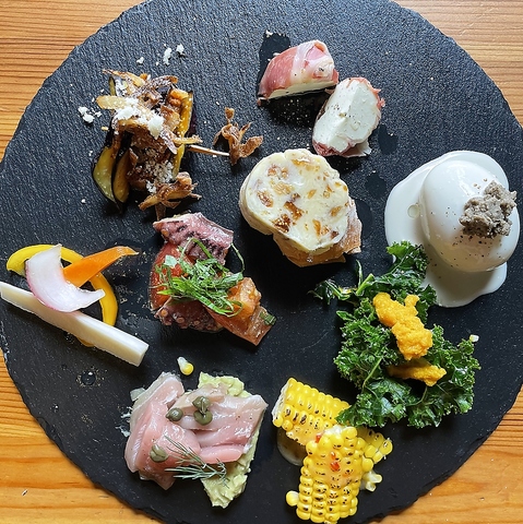 【迷ったらこれ。】真蛸とアボカドのマリネ、牛ハツのカルパッチョ、蟹味噌のウフマヨなど、ワインにぴったりのつまみの盛合わせ。