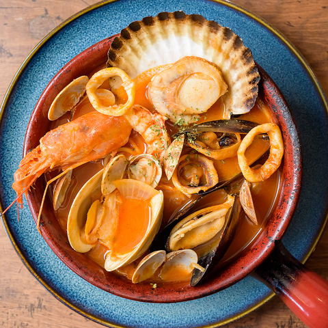 てんこ盛り ムール貝と浅利の白ワイン蒸し(ガーリックバター蒸しに変更可)や魚介ののアヒージョ等々