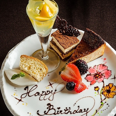 落ち着いた雰囲気でお祝いしませんか♪大切な人の誕生日や、記念日のお祝い、サプライズにも、ケーキ3点盛りからお受けいたします!メッセージもお付けできます◎お気軽にお問い合わせください!