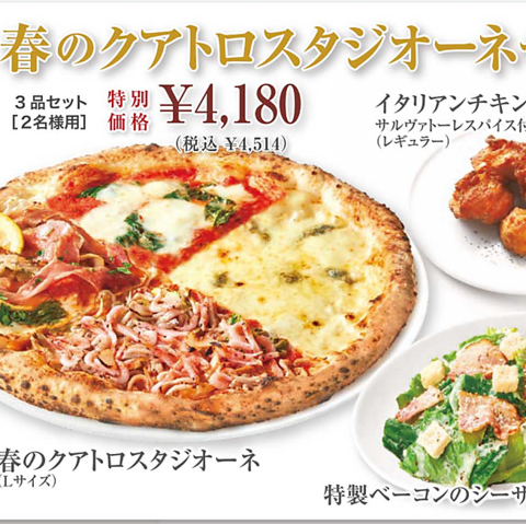 【2名様用】■春のクアトロスタジオーネ■イタリアンチキン サルヴァトーレスパイス付き(レギュラー)■特製ベーコンのシーザーサラダ