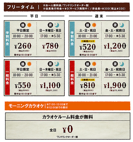 ★フリータイム料金★お一人様料金/ワンドリンクオーダー制/会員発行料金0円(サービス期間中!)/非会員税込+\330※料金表は全て会員料金です。