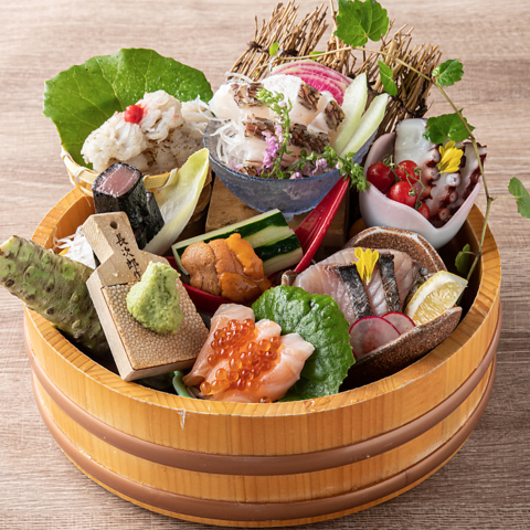 明石鯛、明石蛸、鱧、サワラ、サザエ、ウニなど他数種。※詳しくはスタッフまでお尋ねくださいませ。【昼網で獲れた抜群の鮮度】昼網でとれたばかりの魚が、毎日お昼すぎにお店に運ばれてくるから鮮度は抜群です!その新鮮な魚を料理人が美味しさを活かす調理でおもてなしいたします。お席の専用醤油でお召し上がりください。