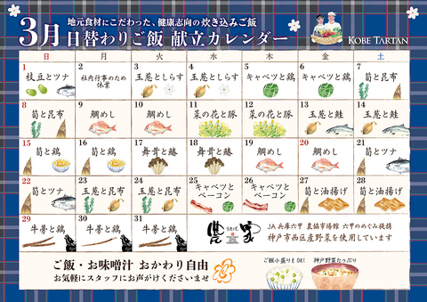 毎月、旬の食材を使用した炊き込みご飯をお作りしております♪ご飯はおかわり自由です!色々食べ比べてみたい方は最初は「ご飯少なめ希望」とスタッフにお申し付けくださいませ。選べるご飯(おかわり自由:但馬産棚田コシヒカリ/高砂の夕日卵かけご飯/炊き込みご飯)