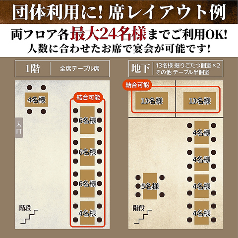 | テーブル | 24名様×1 | 【店内レイアウト】少人数~団体様まで、人数に応じて柔軟にご案内いたします。1階は全席テーブル席。4卓を繋いで、一体感ある宴会をお楽しみいただけます。また、地下には13名様の掘りごたつ個室2部屋をご用意。結合すれば団体様でもご利用可能です。その他のお席もテーブル半個室で、ゆったりとお過ごしいただけます。 |