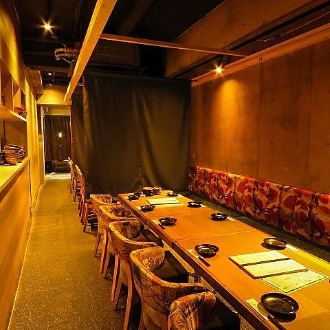 当店は掘りごたつ席や背もたれのある椅子がついたテーブル席など、2名様~最大24名様までご案内可能な席を完備!人気の半個室もございますので、お客様たちだけの空間で、たっぷりと談笑くださいませ。和の雰囲気がおしゃれなお席で、大人の食べ放題・飲み放題を心行くまでお楽しみください。