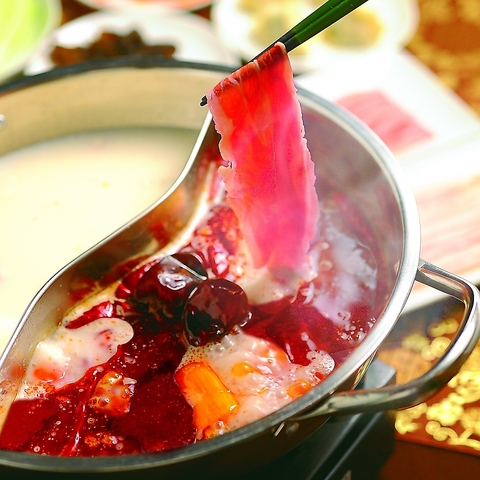 麻辣スープと白湯スープの2種類を同時に味わえる火鍋☆デトックス効果もあるので女性にも大人気♪パクチーたれや餃子、海鮮など追加メニューも豊富なので、お好みの具材でお楽しみいただけます!※1人前の金額です。(2名~)
