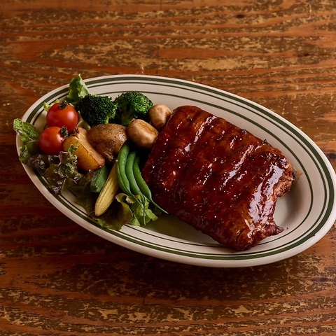 燻製した豚の骨付きロース肉ベイビーバックリブをオーブンで焼き、特製BBQソースで仕上げたアメリカンフードの定番メニューです。