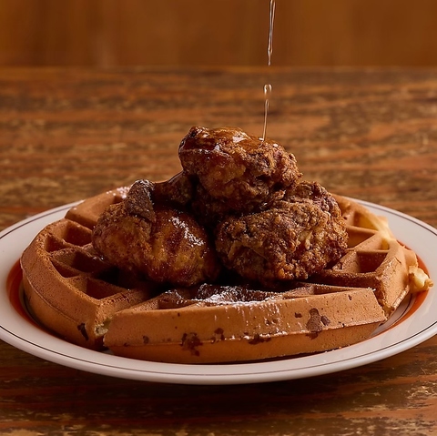 自家製ワッフルの上にスパイシーなフライドチキンをのせた一品!メープルシロップをたっぷりかけてどうぞ!