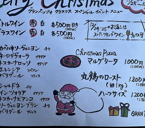 11月25日~12月25日に来店されたお客様限定で表記の赤白グラスワインが500円引き♪12月24.25はお通しでスパークリングワインがつきます!クリスマス限定のピザと鶏のローストもお愉しみください♪