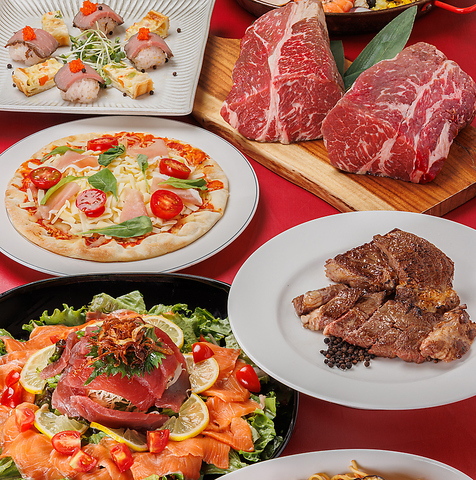 ステーキ食べ放題+飲み放題プラン登場!ガッツリ食べたい方にもおすすめです。ジューシーで旨みあふれる「アンガスビーフ(US PRIME BEEF)」のステーキが食べ放題!ビール、ワイン、ハイボールなど充実の飲み放題に加え、前菜からデザートまで多彩なメニューが勢ぞろい。この内容でこの価格はまさに“超お得”!ご友人や会社宴会で、思う存分食べて飲んで楽しめる特別なお時間を♪