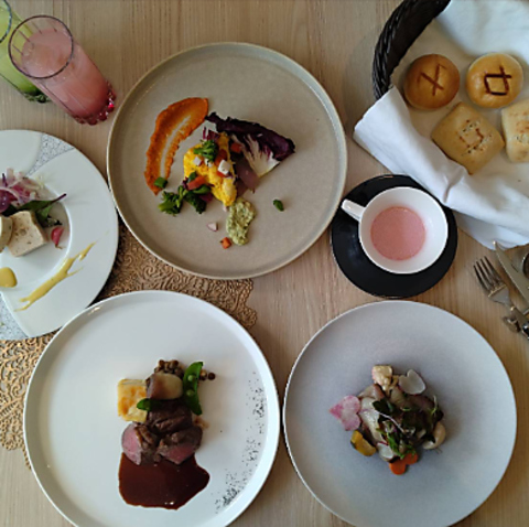 コース料理は様々なメニューをご用意しております。地元の新鮮な食材をふんだんに使用し、旬の味わいを大切にしたフレンチメニューをお楽しみください。薪や鉄板で焼き上げたメイン料理をはじめ、ランチ、ディナー共にシェフのこだわりが詰まった逸品ばかり、フォレストならではのレストランウエディングも承っております。