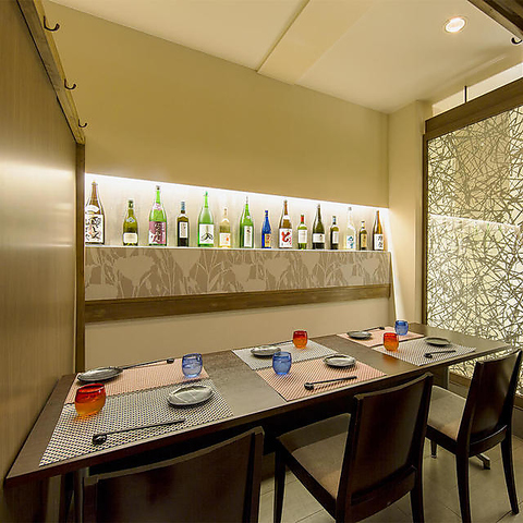 6名様用のテーブル席を1席ご用意。壁際に並ぶ日本酒ボトルが彩る和モダン空間で、ゆったりとした時間をお過ごしください。会社のご宴会やご家族でのお食事、女子会にも最適。旬の鮮魚や牡蠣を使った料理と、厳選された地酒で贅沢なひとときをどうぞ。